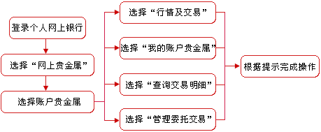 个人客户可以通过我行网点柜面、电子银行(网上银行、电话银行和手机银行)渠道发起交易指令,进行办理账户贵金属的即时交易、委托交易、账务管理和查询等业务。